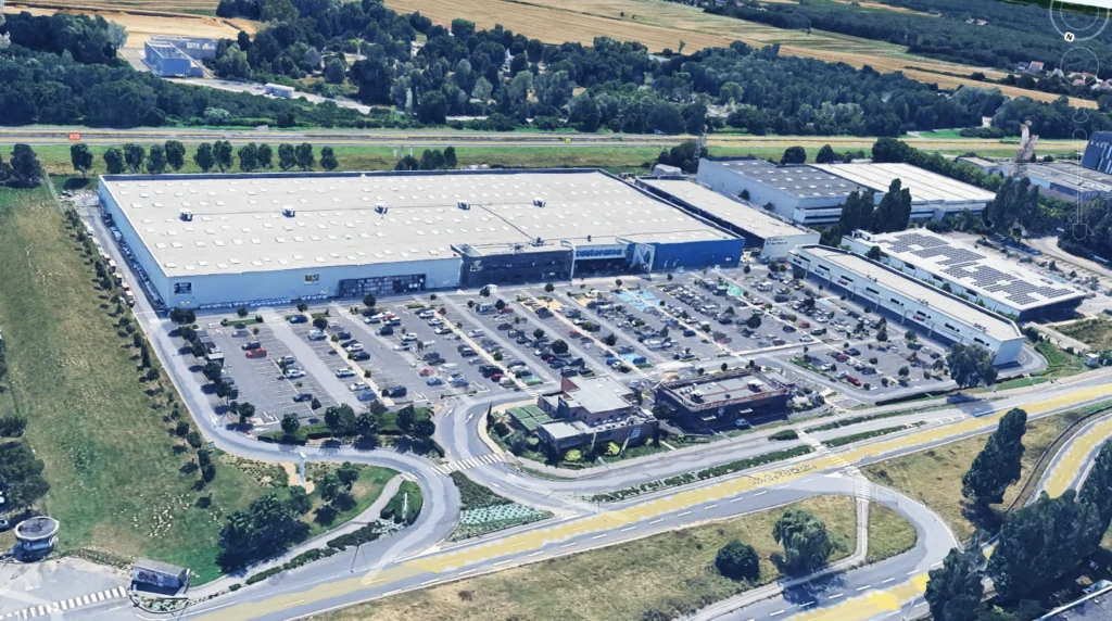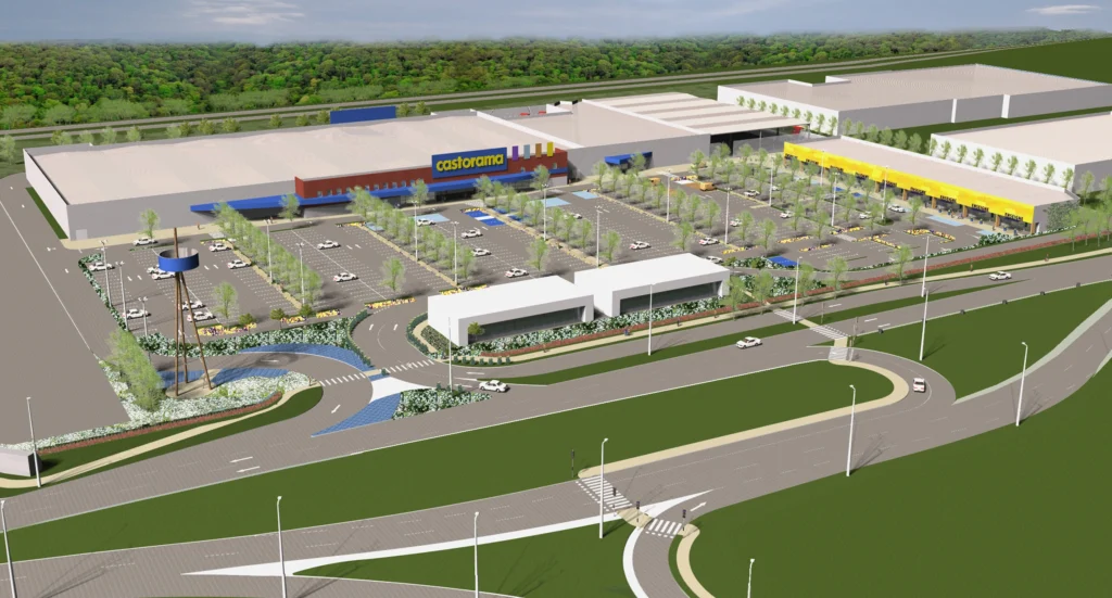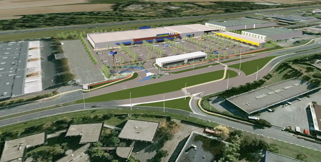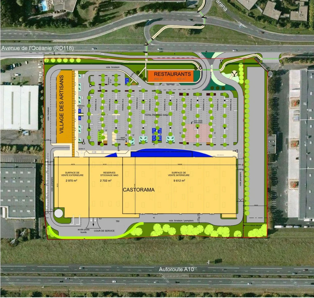 Un bâtiment implanté parallèlement à l’autoroute A10 pour en masquer ses influences. Une position centrale et en fond de scène pour organiser les flux, déployer une trame infiltrante paysagée et support de stationnement. Initialement pensé avec un village des artisans (8 cellules sur 1700 m2) attenant pour créer des relations clients après achats et recréer des métiers de proximité. Une offre de restauration est aussi intégrée au projet. Au-delà de son insertion et de la motrice commerciale de l’ensemble, le projet épouse les ambitions de la collectivité, à savoir :