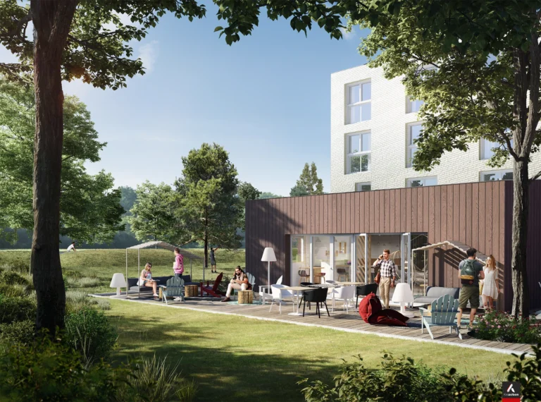 Cette résidence s’implante sur une parcelle boisée. Les étudiants profitent à la fois de la proximité du centre-ville tout en bénéficiant du confort d’un espace vert au cœur de la résidence. Le découpage de l’enveloppe propose un contrepoint aux géométries…