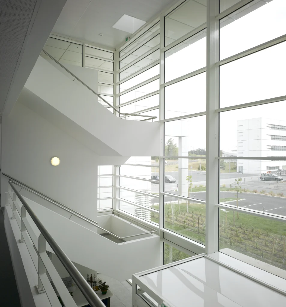 Il s’articule autour d’un patio central permettant une transparence du bâtiment et une communication de services.