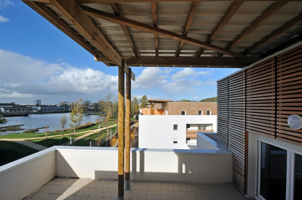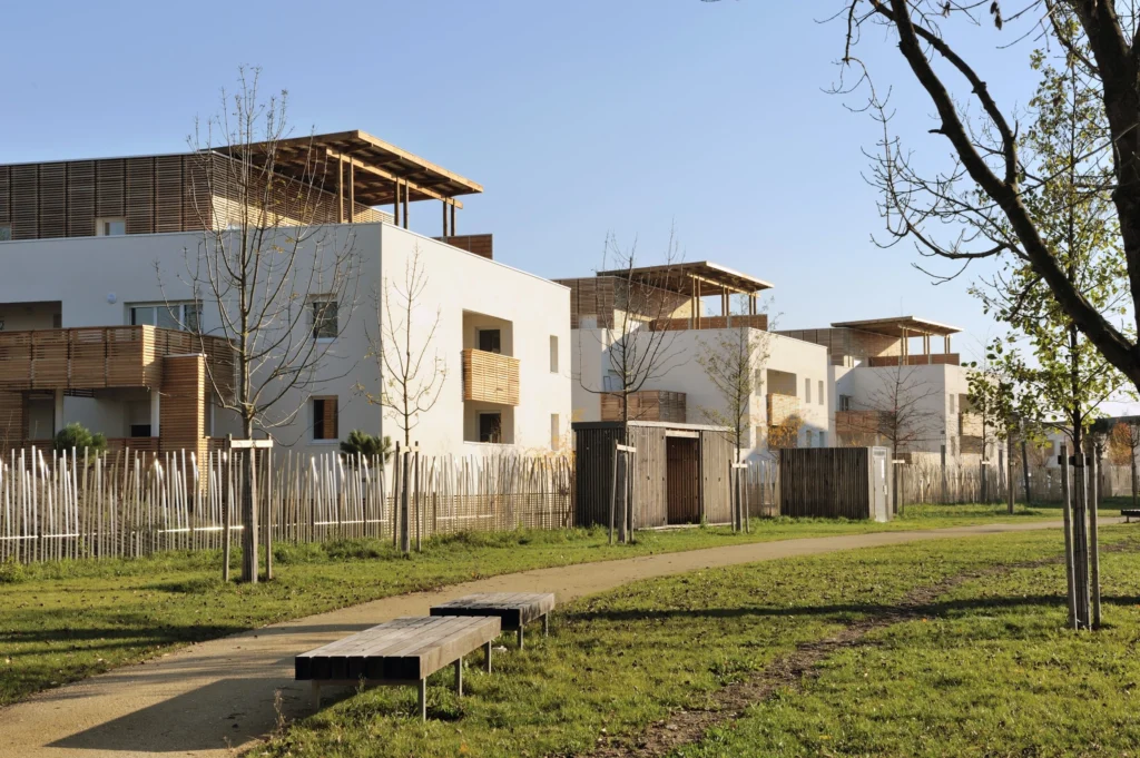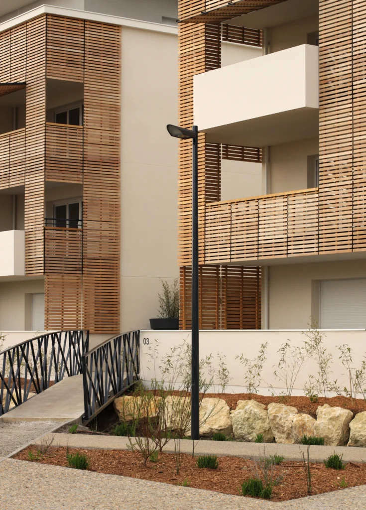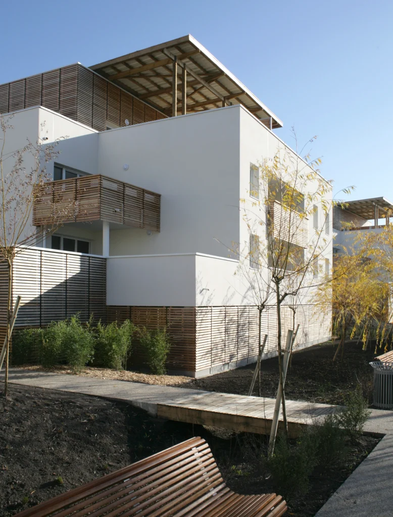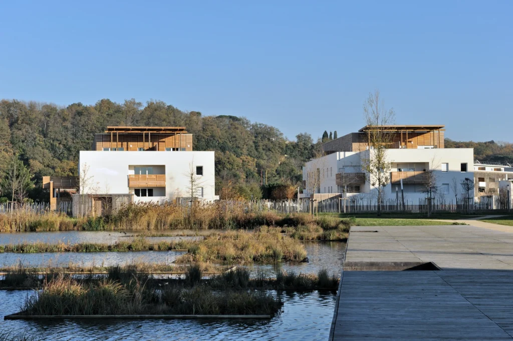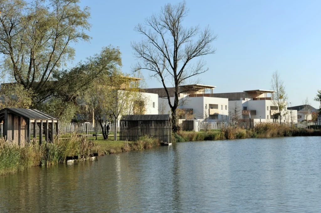 La parcelle est nervurée d’est en ouest, occasionnant des ouvertures visuelles sur les berges du parc public de l’étang. Une écriture qui cherche à mêler l’échelle pavillonnaire et celle d’immeuble collectif. Le projet fait le lien entre habitat individuel, bâtis tertiaires et équipements publics, à la croisée d’une grande variété d’espaces végétaux organisés (jardins ouvriers) ou naturels (abords de l’étang). L’aménagement proposé fait écho aux typologies et s’adapte au futur tracé urbain ainsi qu’aux échelles des espaces qu’elles côtoient (entrée de ville, rapport direct avec l’étang, voie douce).