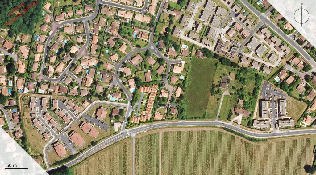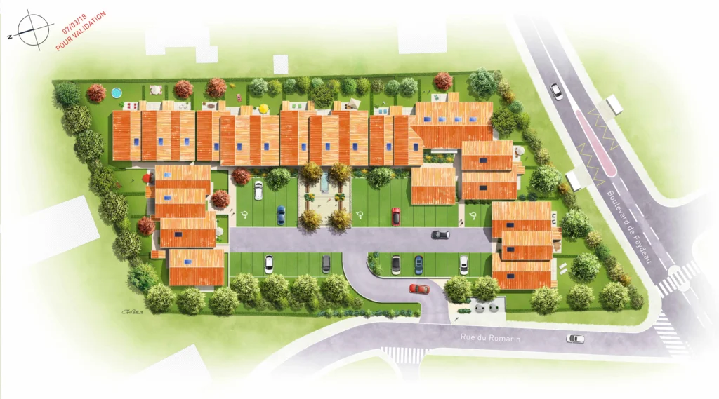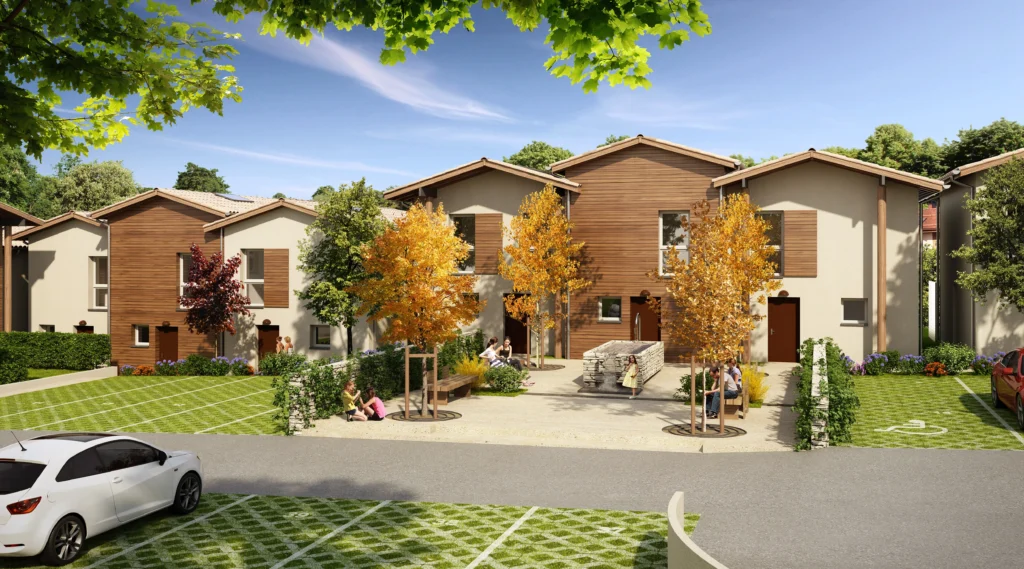 Le projet s’intègre au site d’une vaste étendue de pieds de vigne d’un domaine viticole en face, et d’un quartier pavillonnaire autour. Les logements s’organisent autour d’une place centrale aux accents bucoliques, agrémentée d’une fontaine. L’alternance des matières de ses façades, au ton clair et de bardage bois, lui confèrent une unité de caractère authentique et chaleureux.